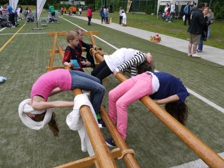 Parallel konnten sich Kinder wie Erwachsene an den verschiedensten Sportarten probieren. Dank schon im Vorfeld unermüdlicher Helfer standen viele Sportgeräte aus der Turnhalle bereit, und so konnten gerade die Kinder nach Herzenslust hüpfen, turnen, klettern und auf dem Schwebebalken balancieren. Auch das Schwungtuch erfreute sich unter unermüdlicher Anleitung von Syllan Bockwoldt, Miriam Rasch und Sabine Hagelstein großer Beliebtheit. Diese 3 bewiesen wieder eindrucksvoll, warum es in Duvenstedt kaum ein Kind gibt, das nicht durch ihre Kindersporthände gegangen ist!